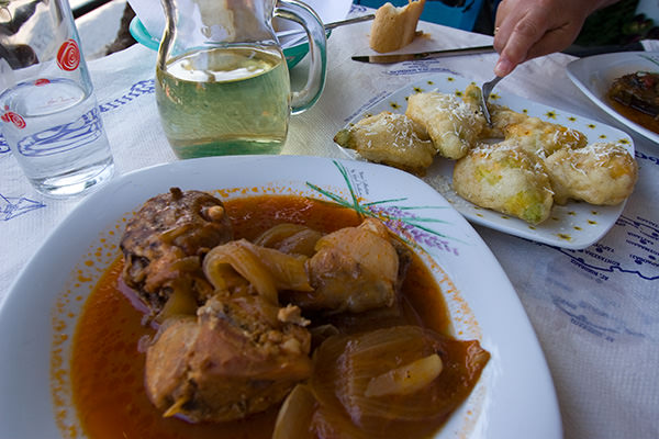 Dabei läge das Gute doch so nah - zumindest vom Parken her gesehen. Das "Vraxos" liegt genau über dem dörflichen Parkplatz. Das ist natürlich strategisch gesehen keine günstige Lage - wollen doch die der Kurbelei müde gewordenen Mietwagenchauffeure samt Beifahrer sich die steifen Beine vertreten. Kulinarisch betrachtet ist das "Vraxos" - der Fels - die erste Wahl. Jannis und Xrisanti Tzanenas Taverne ist der dörfliche Mittelpunkt von Vourliotes. In dem geräumigen Lokal finden ganzjährig Hochzeiten und andere Festivitäten statt. Selbst Sohn Vassilis hat dann alle Hände voll zu tun. Seine Mutter Xrisanti ist eine exzellente und erfahrene Köchin.